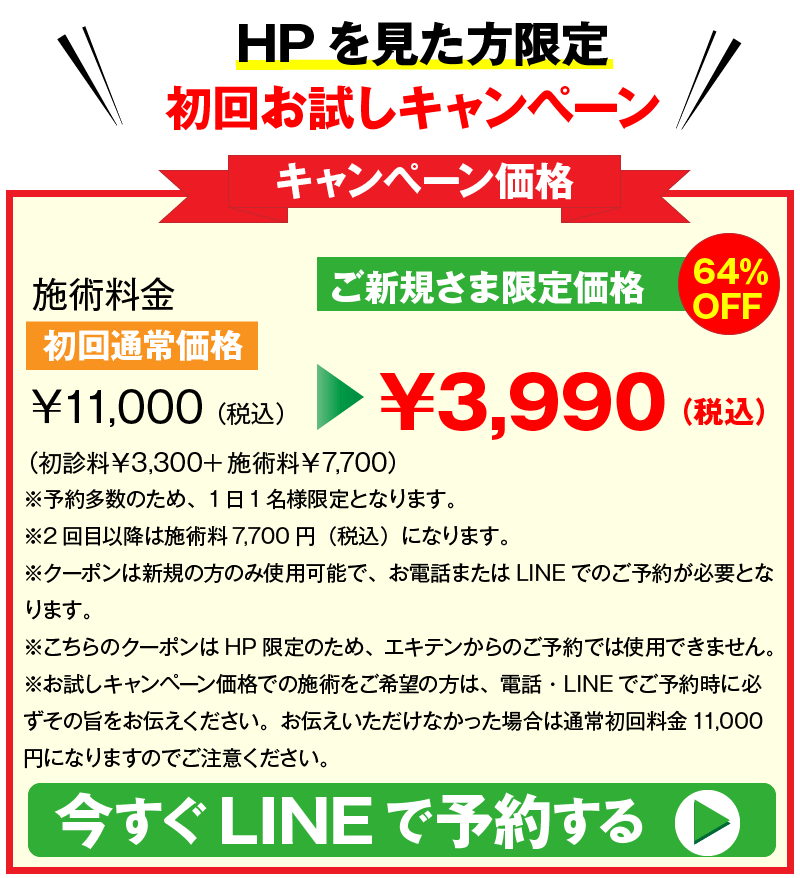 実費施術の場合、通常初回料金は初診料3300円、施術料7700円で11000円、2回目からは7700円になります。また、1ヶ月以上間隔が開くと再度初診料3300円がかかります。 - どんな服装で行けばいいですか?